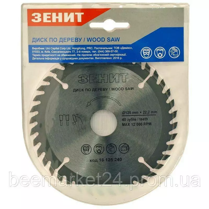 Диск пиляльний для дерева Зеніт 40 зубців призначений для роботи з дисковими пилками. Завдяки застосуванню якісної інструментальної сталі та високоточного припою зубів, такі диски вирізняються високими експлуатаційними показниками. Самі зубці — виготовлені з вкрай твердого сплаву з точною алмазною шліфуванням. Зубці диска мають чергуваний нахил, що забезпечує точність і чистоту пропилювання. Такі диски можна використовувати й для поздовжнього, і для поперечного розпилювання деревини різної твердості. Оскільки диск має компенсаційні прорізи, він може витримувати високі температури за великої інтенсивності роботи, без деформації поверхні з мінімумом коливань, що дає змогу знизити безпосереднє навантаження на рухомі частини обладнання.