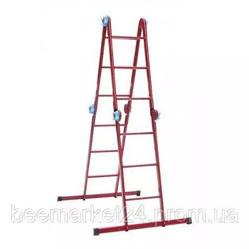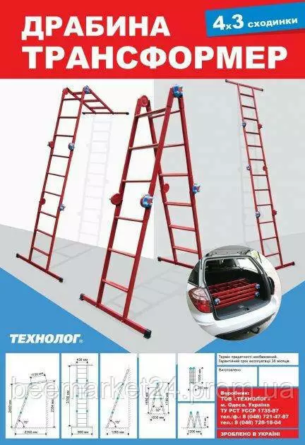 Товщина стінки 0,8 та 1,0 мм. Дві опорні мітки для стійкості. Три комплекти потужних фіксуючих "замків". Може використовуватися, як приставні сходи, сходи з упором на стіну, двостороння драбина, і практичний поміст. Має компактні розміри, зручні для транспортування та зберігання. Застосовується для багатьох видів робіт: будівельні та ремонтні роботи, електромонтажні роботи, роботи в саду, побутові потреби, використання в магазинах, підсобних приміщеннях і т.д. Поміщається у багажник легкового автомобіля.