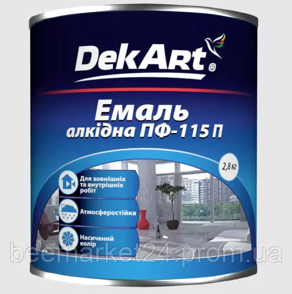 Емаль алкідна ПФ-115П призначена для фарбування попередньо заґрунтованих металевих, дерев'яних і мінеральних поверхонь (віконних рам, підвіконь, дверей, металевих і дерев'яних огорож), експлуатованих як усередині приміщень, так і зовні.
