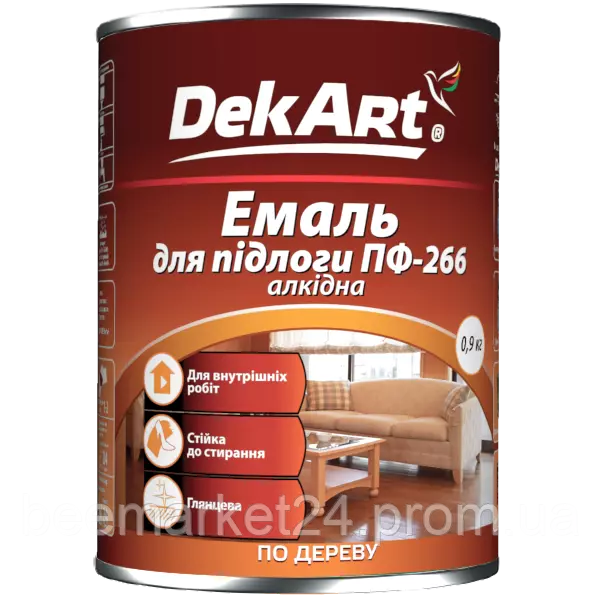 Емаль алкідна ПФ-266 для підлоги призначена для фарбування раніше пофарбованих чи попередньо підготовлених непофарбованих дерев’яних підлог та інших дерев’яних і бетонних поверхонь, що експлуатуються всередині приміщень.