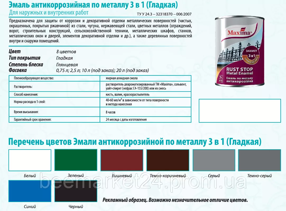 Емаль антикорозійна для металу призначена для захисту від корозії та декоративного оздоблення металевих поверхонь, а також дерев'яних поверхонь усередині та зовні приміщень.