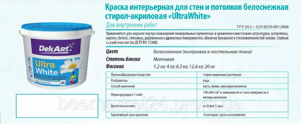 Білосніжна фарба. Завдяки високому ступеню білини візуально освітлює приміщення. Не жовтіє з часом. Створює матове покриття, стійке до сухого очищення. Паропроникна. Не розбризкується під час нанесення.
