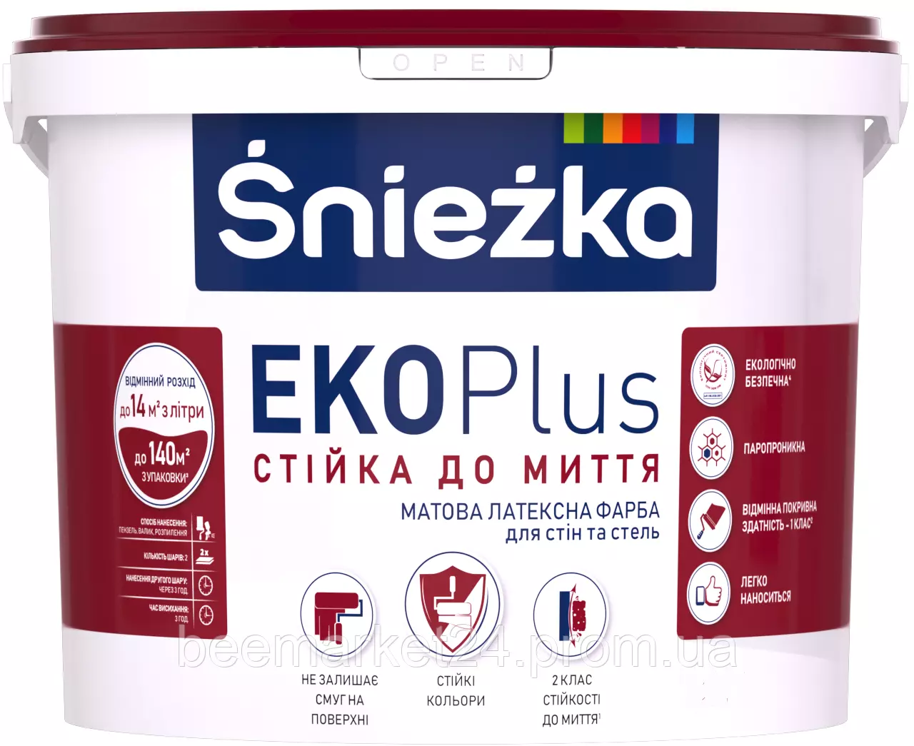 Śnieżka EKO Plus - матова латексна фарба, якою властива підвищена стійкість до миття. Завдяки відбірковим загустителям і компонентів фарба не залишає смуг на поверхні і їй характерна відмінна покривність і стійкість кольору. Фарбу легко наносити і вона екологічно безпечна.
