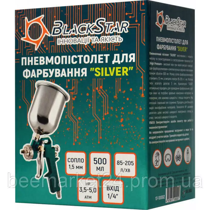 Фарбопульт пневматичний BlackStar SILVER 17-10002 виготовлений із міцного металу та сконструйований з використанням технології НР (High Pressure — високий тиск за малої витрати повітря). Цей фарбопульт комплектується верхнім металевим бачком об'ємом 500 мл. Розмір форсунки становить 1,5 мм, а витрата повітря 85-205 л/хв. Робочий тиск досягає 5 атм. Фарбопульт BlackStar SILVER 17-10002 оптимально підходить для проведення фарбувальних робіт, за яких не потрібне ідеальне нанесення матеріалу на поверхню, але важлива швидкість і площа покриття. Має плоский і овальний тип струменя; Підходить для більшості різновидів лакофарбових матеріалів; Технологія НР дає змогу досягати дуже високої швидкості повітряного потоку, а отже, і високої швидкості покриття.