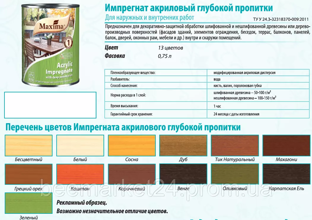 Призначений для декоративно-захисного оброблення шліфованої та нешліфованої деревини або деревних поверхонь (фасадів будівель, елементів огорож, альтанок, терас, балконів, панелей, дверей, віконних рам, меблів та ін.) всередині та зовні помещений. Під час фарбування поверхонь, які піддаються механічному стиранню (смуг, лавочки, елементи меблів тощо) рекомендуємо використовувати поліуретан-акриловий лак (яхтний або паркетний, залежно від умов експлуатації).