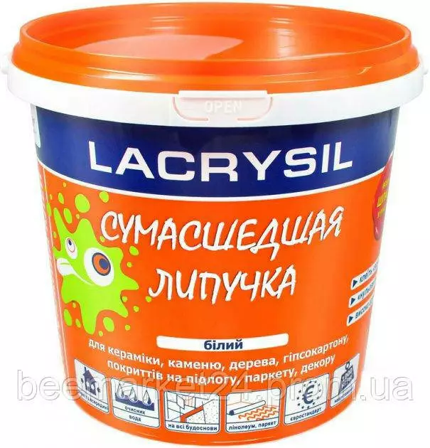 Водостійкий професійний будівельний клей Lacrysil для настінних покриттів і покриттів на підлогу. Призначений для проведення зовнішніх і внутрішніх ремонтно-монтажних робіт із каменю, дерев'яних, гіпсокартонних плит, підлогових покриттів (лінолеуму, ковроліну), виробів із пінополістиролу, мінеральної вати основам із каменю, цегли, ОСБ, а також бетонних, цегляних, металевих, дерев'яних та інших поверхонь.
