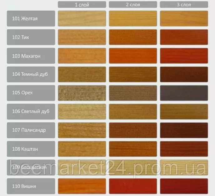 Свойства: Імітує цінні породи деревини й одночасно виконує функції ґрунтовки, антисептика та декоративного лаку. Глибоко просочує й надійно захищає деревину від руйнівного впливу довкілля (ультрафіолетове випромінювання, опади, температурні коливання тощо). Запобігає руйнуванню деревини комахами, цвіллю та грибками. Має чудову адгезію, стійкий колір і глянцю, не розтріскується згодом і не перешкоджає «диханню» поверхні.